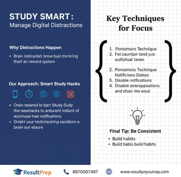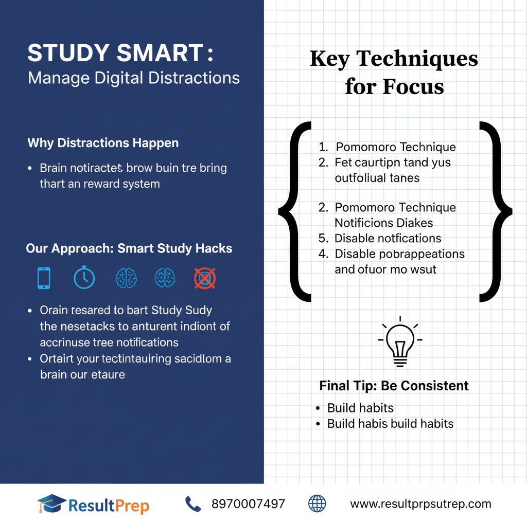 Struggling with phone addiction while studying? Learn practical ways to manage digital distractions, improve focus, and boost productivity using smart techniques like Pomodoro, focus mode, and study routines—perfect for CUET, CLAT, CA Foundation, and board exam students.